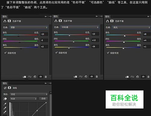 接下来调整整张的色调,此类调色比较常用的是色彩平衡,可选颜色,曲线等工具,在这里只用到了色彩平衡,曲线两个工具。