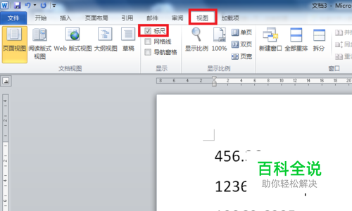 完成这个操作需要标尺辅助。如果Word 界面中没有显示标尺,在菜单中选择“视图”菜单卡,勾选“标尺”,显示出标尺。