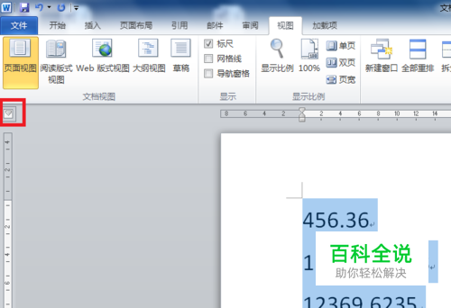 选中需要对齐小数点的数字,然后在标尺左上角,连续点击按钮(下图红框所示),直到出现小数点标志(第二个图)