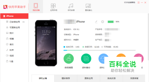 将iPhone连接电脑,同时打开快用苹果助手PC端,可以看到如下界面。