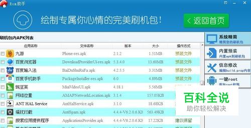 刷机包加载完毕后,你会看到rom包里的应用名称、文件名、版本信息、大小、操作方式等信息。操作方式下面显示“预装软件”是可以删除的;“建议保留”则是不需要删除。如果想删除一个文件,直接在文件前的方框里√即可。