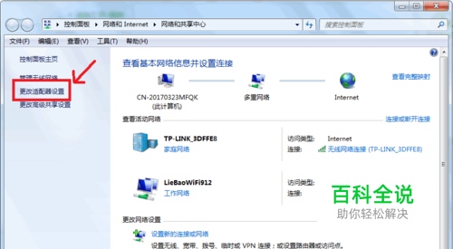这个时候,右击桌面右下角的无线图标,选择‘打开网络和共享中心’选项,在弹出窗口中选择‘更改适配器设置’