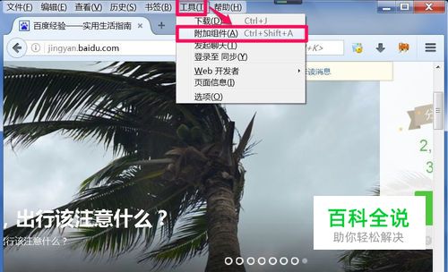 设置附加组件自动更新方法,先打开浏览器,在窗口中,选择“工具”菜单下的“附加组件”这一项。