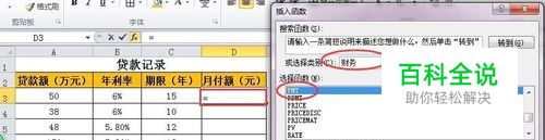 选中D3单元格,按键盘上的Shift+F3,调出函数窗口,选择函数类别为“财务”,选中“PMT”函数。