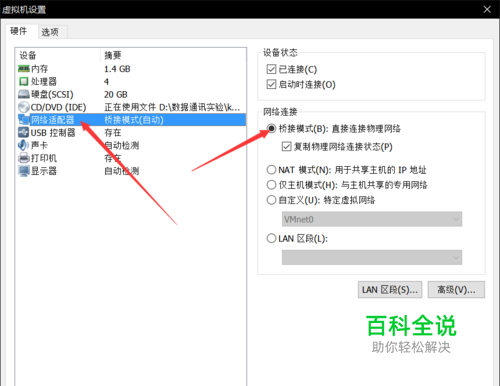 2、再选择网络适配器中的桥接模式,复制不复制无所谓 确定