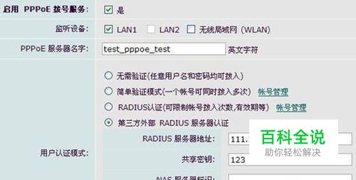 海蜘蛛端配置方法: 1、 登录海蜘蛛Web管理页面(默认地址为:http://192.168.0.1:880) 2、 进入海蜘蛛PPPoE服务端的设置:进入“服务应用”下的“PPPoE拨号服务”项。 3、 勾选启用PPPoE拨号服务,在下面的用户认证模式里选择第三方外部 RADIUS 服务器认证,如下图: