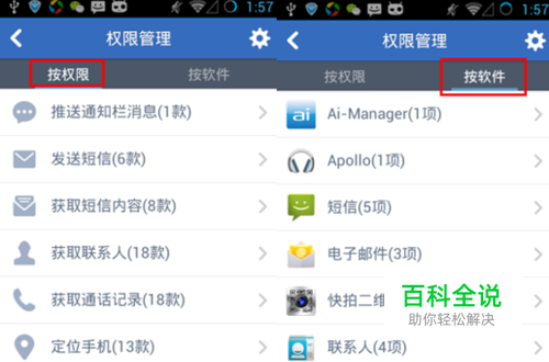 进入后可看到管家分为按照权限和按软件管理2种选择类型,每个栏目下都可见可监控到的隐私权限类别。