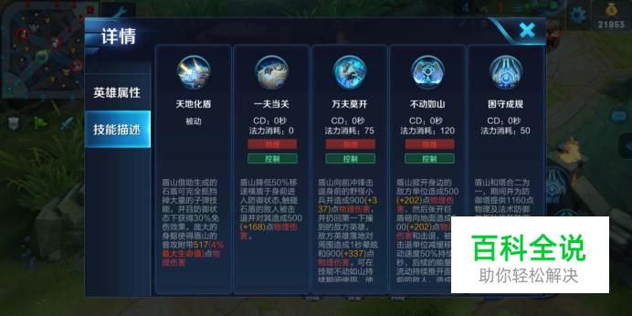 我们看一下盾山的被动技能:天地化盾。盾山的所有盾牌(小盾牌或者大盾牌)都可以是自身获得固定免伤效果,以及盾牌持续期间能够抵挡绝大部分飞行弹道技能。