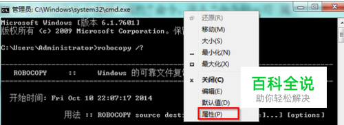 首先打开win7系统中的命令提示符窗口,然后使用鼠标右键单击“命令提示符”窗口的标题栏,在出现的右键菜单栏中选择“属性”;
