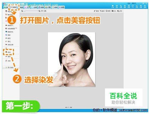 在软件下打开图片,在“美容”菜单下选择“染发”功能。选择“染发”功能