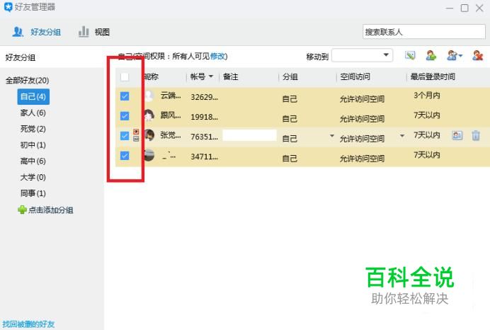 在好友管理界面中,在需要进行批量移动的好友前面的方框内打“√”,在最上方的方框内打“√”,可以选中当前分组中全部的好友。