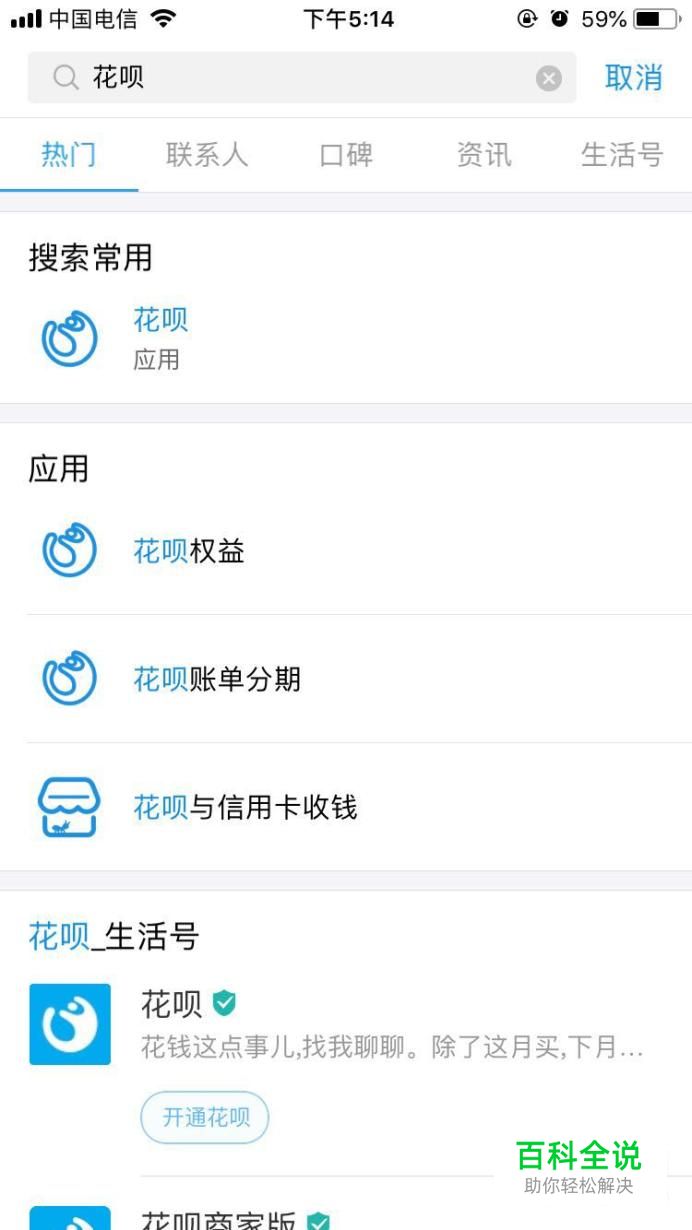 打开支付宝软件,在搜索框中输入【花呗】,点击【花呗应用】进入。