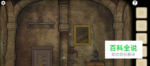 紧接着,如图所示,来到有显微镜的页面,点击下午见下面的柜子进去。然后看到需要解密,才能将上面的竖转成横,才能打开。图中的4个不同颜色的点是解密的关键。