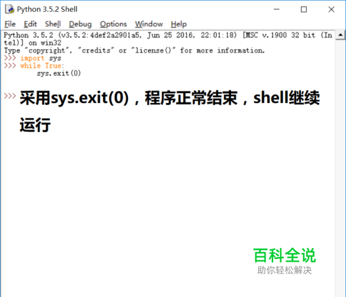 方法1:采用sys.exit(0)正常终止程序,从图中可以看到,程序终止后shell运行不受影响。