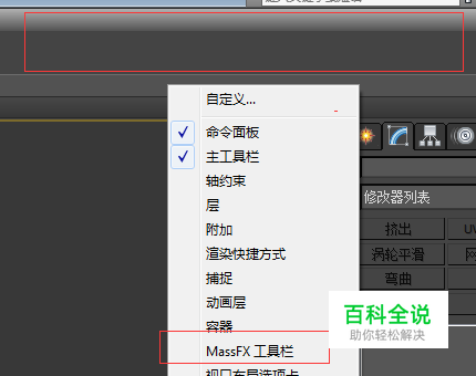 打开3DMAX,并调出MASSFX工具。在工具栏空白处,单机右键,在菜单中选择MASSFX工具。