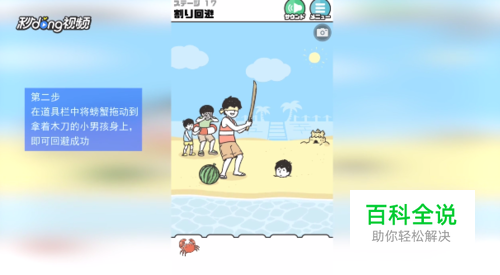 在道具栏中将螃蟹拖动到拿着木刀的小男孩身上。