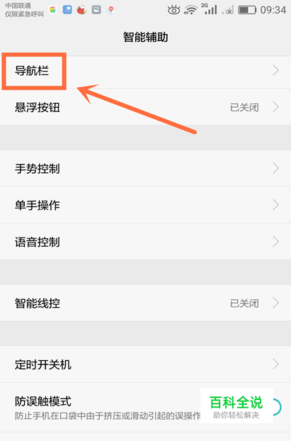 3.第三步,跳转到手机“ 智能辅助”选项页,选择点击“ 导航栏”按钮;