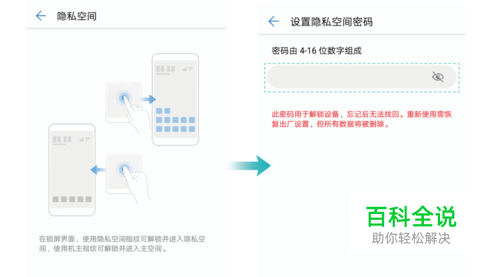 3. 点击”开启“后,根据界面提示设置隐 私空间密码(如:5678)。