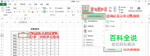 在EXCEL依次点击①将鼠标光标放置商品1某一价格单元格处②条件格式③突出显示单元格规则④其他规则