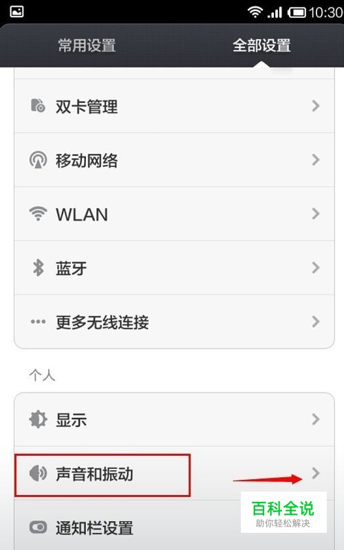 在设置中找到全部设置,这里找到声音和振动,然后在里面找到手机铃声,当然在常用设置里也有手机铃声的设置选项,习惯哪个用哪个。