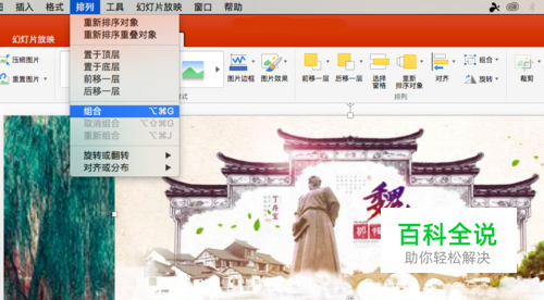 作为示范,我们用一张图复制一下,变成两张,调整好位置,选中两张图片,然后在排列里面找到组合这一选项,点击
