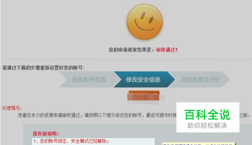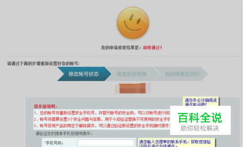 在验证成功联系手机完成确认操作后,帐号的锁定和安全模式等游戏保护状态即会解除,请留意确认。注:此时帐号资料仍未开始修改,请勿关闭页面,并按页面提示点击按钮进行下一步操作!