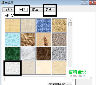 此时页面会弹出填充效果的编辑页面,在此编辑页面里我们先点击上方主菜单栏里的【纹理】按钮,然后选择合适的纹理作为页面的背景,当然我们也可以点击上方主菜单里的图片按钮,选择自己已经准备好的图片作为背景,选择完毕后点击下方【确定】按钮。