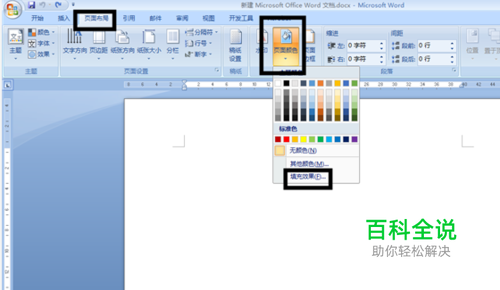 点击打开WORD的软件,在WORD软件的首页我们点击上方主菜单栏里的【页面布局】按钮,然后选择下方子菜单栏里的【页面颜色】,在弹出下拉菜单里我们点击下方【填充效果】