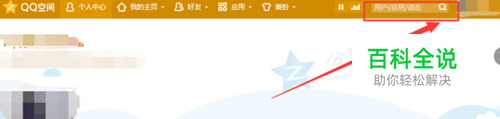 QQ空间进入之后,我们注意到在空间最上面的位置哪里有个搜索的对话框,里面显示用户,应用,动态,我们把鼠标定位在框里。