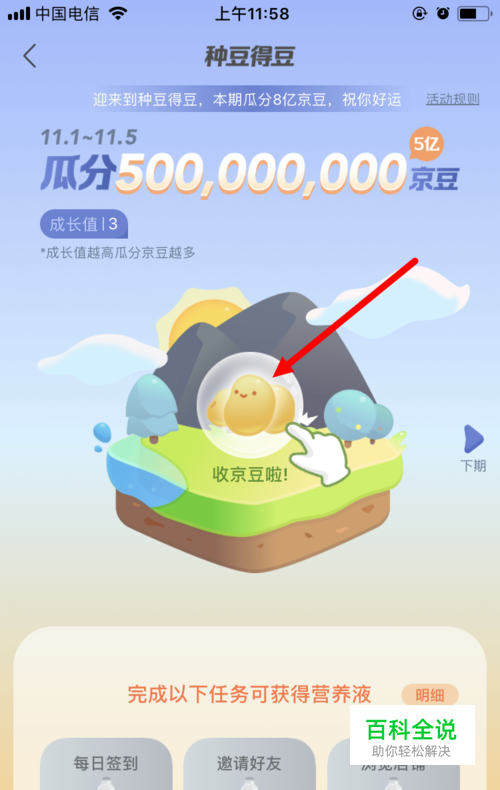 小编再以上期活动为例,为大家讲解活动结束后如何收货京豆。当期活动结束后,回到该页面,可以发现京豆长成了,点击 收京豆 。