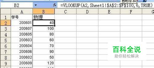 详细说明一下,在此vlookup函数例子中各个参数的使用说明: 1、a2 是判断的条件,也就是说sheet1表和sheet2表中学号相同者,即sheet2表a列对应的数据和sheet1表中学号列a列的数据相同方能引用;2、sheet1!$a$2:$f$100 是数据跟踪的区域,因为需要引用的数据在f列,所以跟踪的区域至少在f列,sheet1!是不同表间引用所用的表名称,和标志是表间引用的!符号,$是绝对引用(关于绝对引用可以参考这里),$a$2:$f$100 表明从A2到F100单元格的数据区域,如果数据区域不止100,那么可以直接使用A:F,这样虽然方便但是有风险,因为如果sheet1表的下方还有其它数据,就有可能出现问题;3、6 这是返回什么数的列数,如上图的物理是第6列,所以应该是6,如果要求英语的数值,那么此处应该是54、是否绝对引用,如果是就输入 true 如果是近似即可满足条件 那么输入false (近似值主要用于带小数点的财务、运算等)5、vlookup是垂直方向的查找,如果是水平方向查找可使用Hlookup函数,使用方法类似。