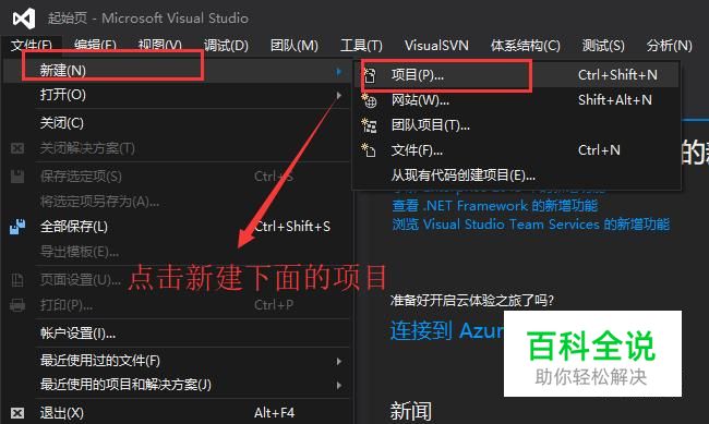 打开Visual Studio软件,点击文件菜单,然后选择新建下面的项目,如下图所示