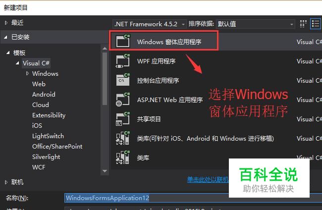 接下来在新建项目界面中选择Windows窗体应用程序,如下图所示