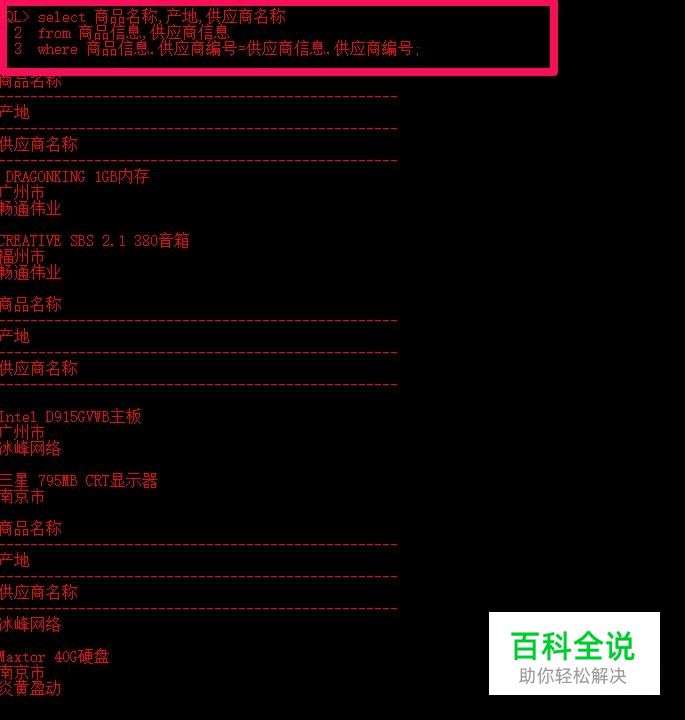 但此时结果显示该查询语句共显示了200行记录,这显然是错误的。因为仅仅通过select和from子句连接那么查询结果将是一个通过笛卡儿积生成的表,包含大量无意义的信息。而where语句可以有效避免笛卡儿积的出现。只有当两个表具有相同匹配的列时才返回结果集。例如下面语句通过在where子句中使用连接条件,实现了每件商品名称,产地,供应商名称信息。