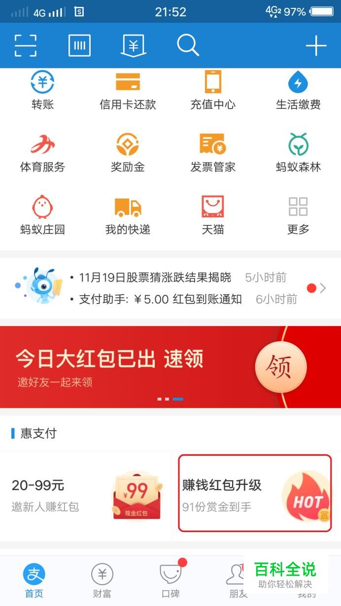 首先,我们打开手机支付宝,在首页的中间,可以看到图示的“赚钱红包升级”活动按钮,点击一下。