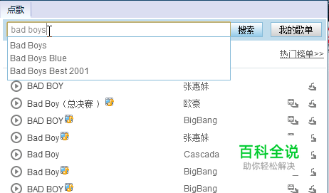 然后会弹出一个对话框,可以在搜索框中输入想要为好友点播的歌曲,如图选择“Bad boys”,然后进行搜索