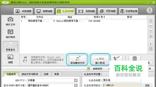 为个性相册搭配个性音乐 要制作个性相册,音乐当然是必不可少的。点击如下界面的“背景音乐”选项卡,在这个界面上操作即可添加你喜欢的个性音乐和动感歌词字幕。
