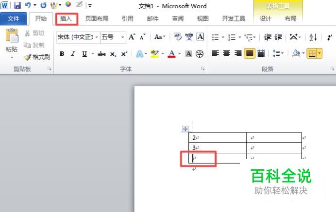 首先,我们打开一个word文档,如图所示,然后我们点击选中图示中的单元格,之后点击插入;