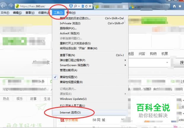 Internet选项 打开IE浏览器,然后点击【工具】,在弹出的下拉菜单中选择【Internet选项】,如下图所示: