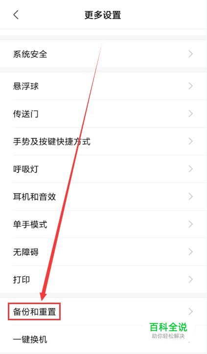 在“更多设置”界面找到“备份和重置”。