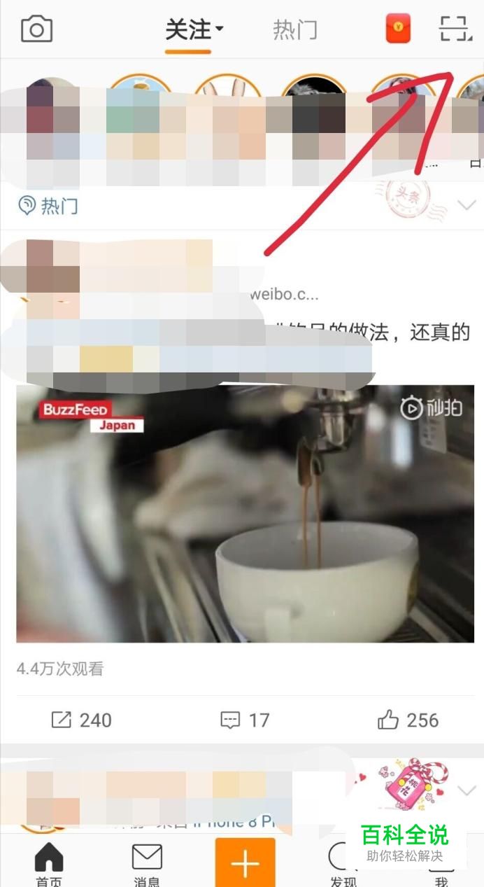 首先登陆新浪微博,然后在首页点击右上角的扫一扫标志,如下图。