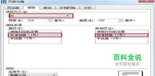 点击【纸张大小】以后来到页面设置界面,选择纸张模块,再选择纸张大小【A4】,纸张来源选择【标准纸盘(一号)】。再进行【确认】即可。