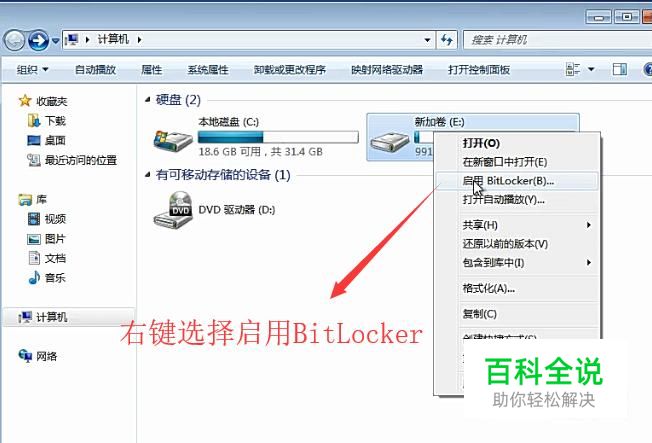 首先右键单击要加密的磁盘,选择启动BitLocker选项,如下图所示