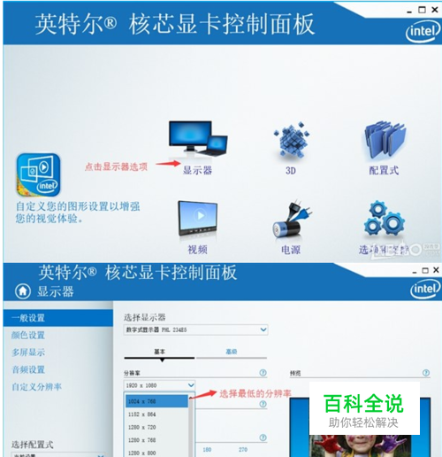 方法一:调节驱动 打开核心显卡控制面板,根据图示操作。点击显示器选项进行相关调整,调整完后图标会变得很大,继续往下进行。