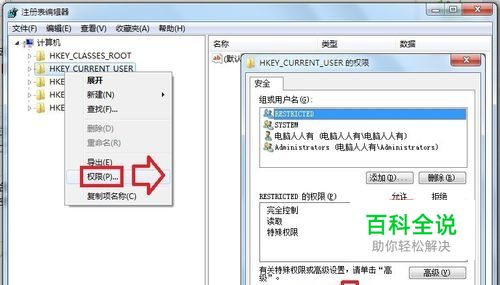 先给权限,右键点击HKEY_CURRENT_USER→权限→涵盖当前的账户→允许完全控制→确定。 重启电脑,看是否解决了?不行,再进行下一步。