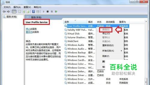确保负责加载,卸载用户配置文件的 User Profile Service服务已经开启。如果启动菜单是灰色的(不可同):服务属性→启动类型→自动或者手动→应用→启动→确定
