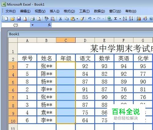 下面可以看到在年级这一栏下面的单元格右下角会现一个下拉三角形;