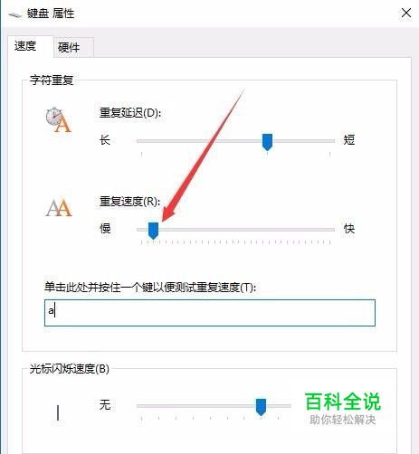 另外接着设置重复的速度,这个要设置的“慢”一些,这样即使万一有重复了,也会输入的字符更少一些。