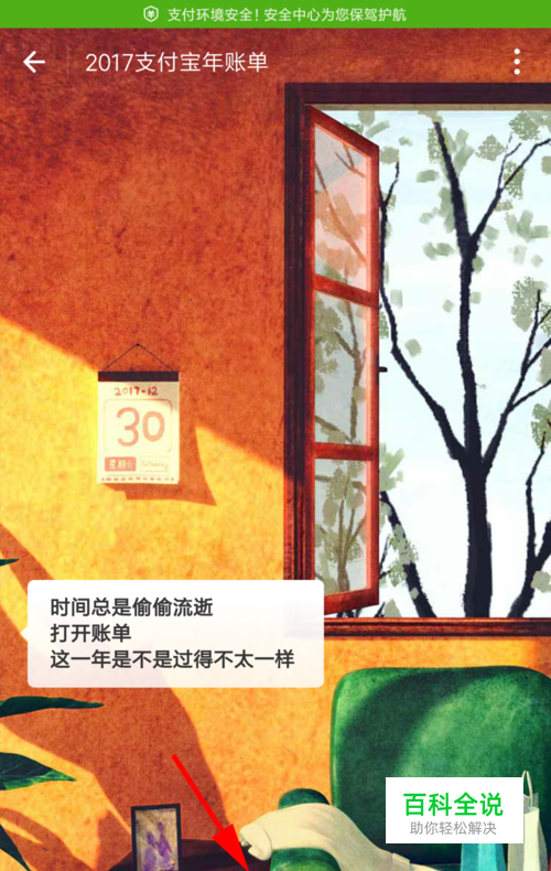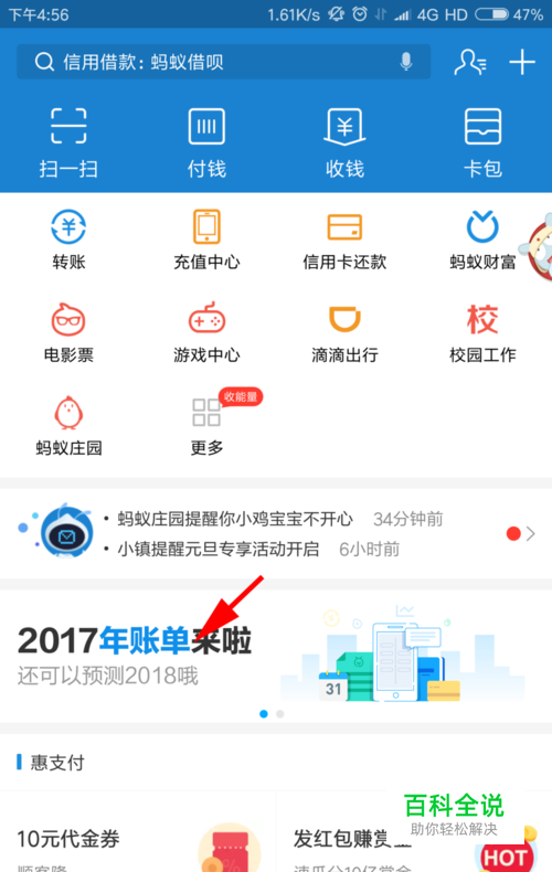 打开支付宝,点击图中箭头所示的2017年账单来啦