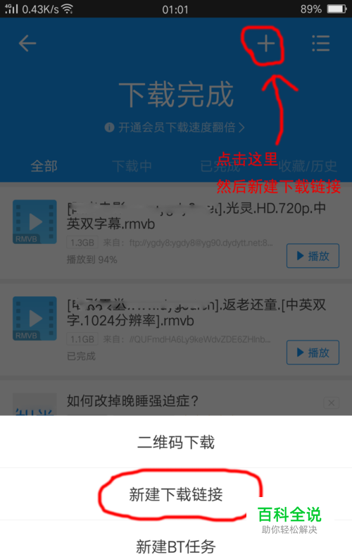 在“下载管理”的界面中点击右上角的“加号”弹出选项,再点击“新建下载链接”